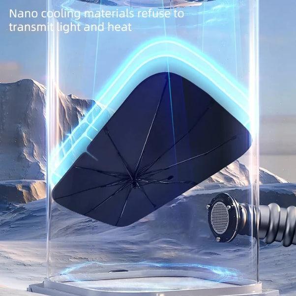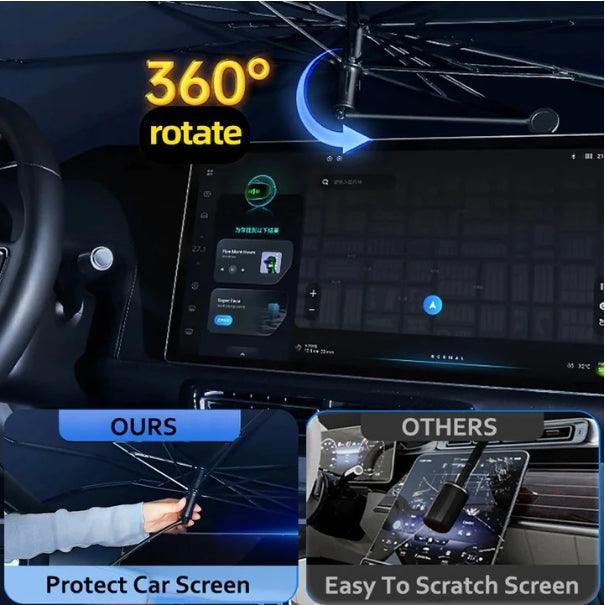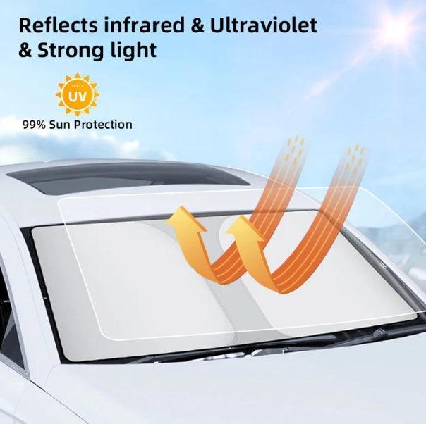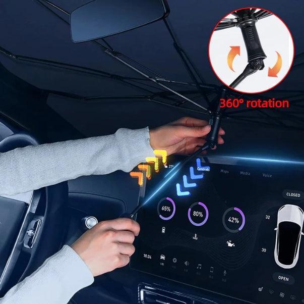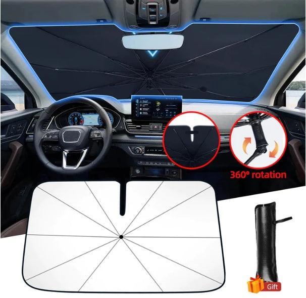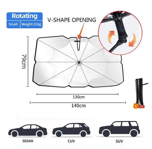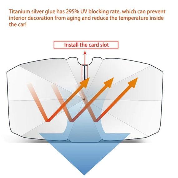 Unser Windschutzscheiben-Sonnenschutz in Schirmform ist mit einer Titan-Silber-Klebstoffbeschichtung aus Polyesterverbundstoff versehen, die unglaublich wirksam gegen Sonnenhitze ist! Die 10 stabilen gehärteten Stahlstangen sorgen für eine überragende Langlebigkeit des Sonnenschutzes!
